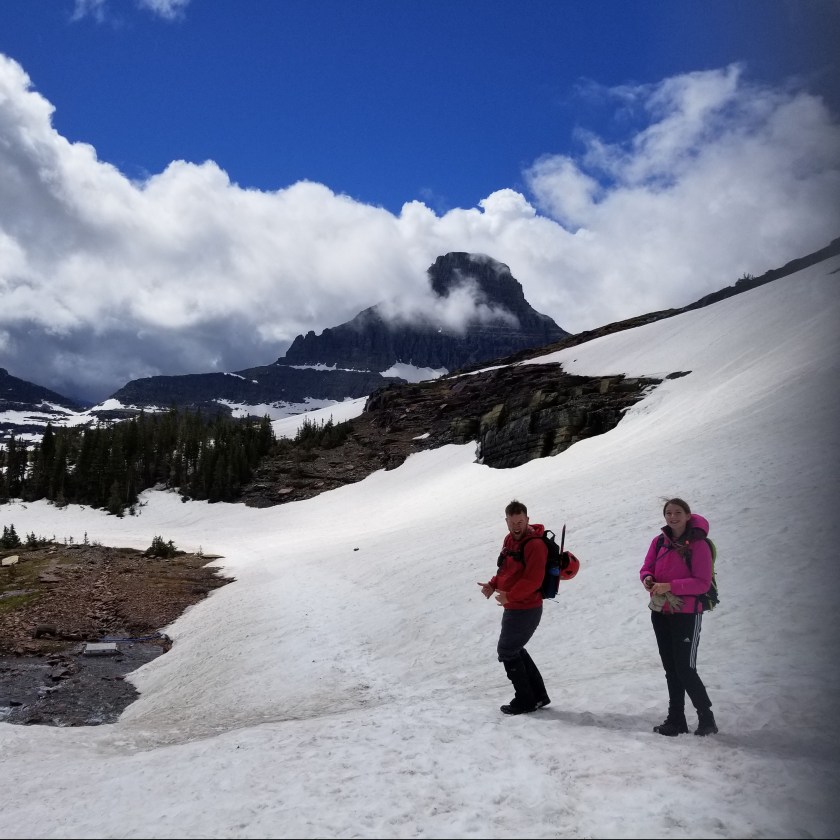 Next Image Chris’ GNP Photos Cory and Megan having fun in the snow at the base of Mt. Oberlin. Reynolds Mountain is in the distance